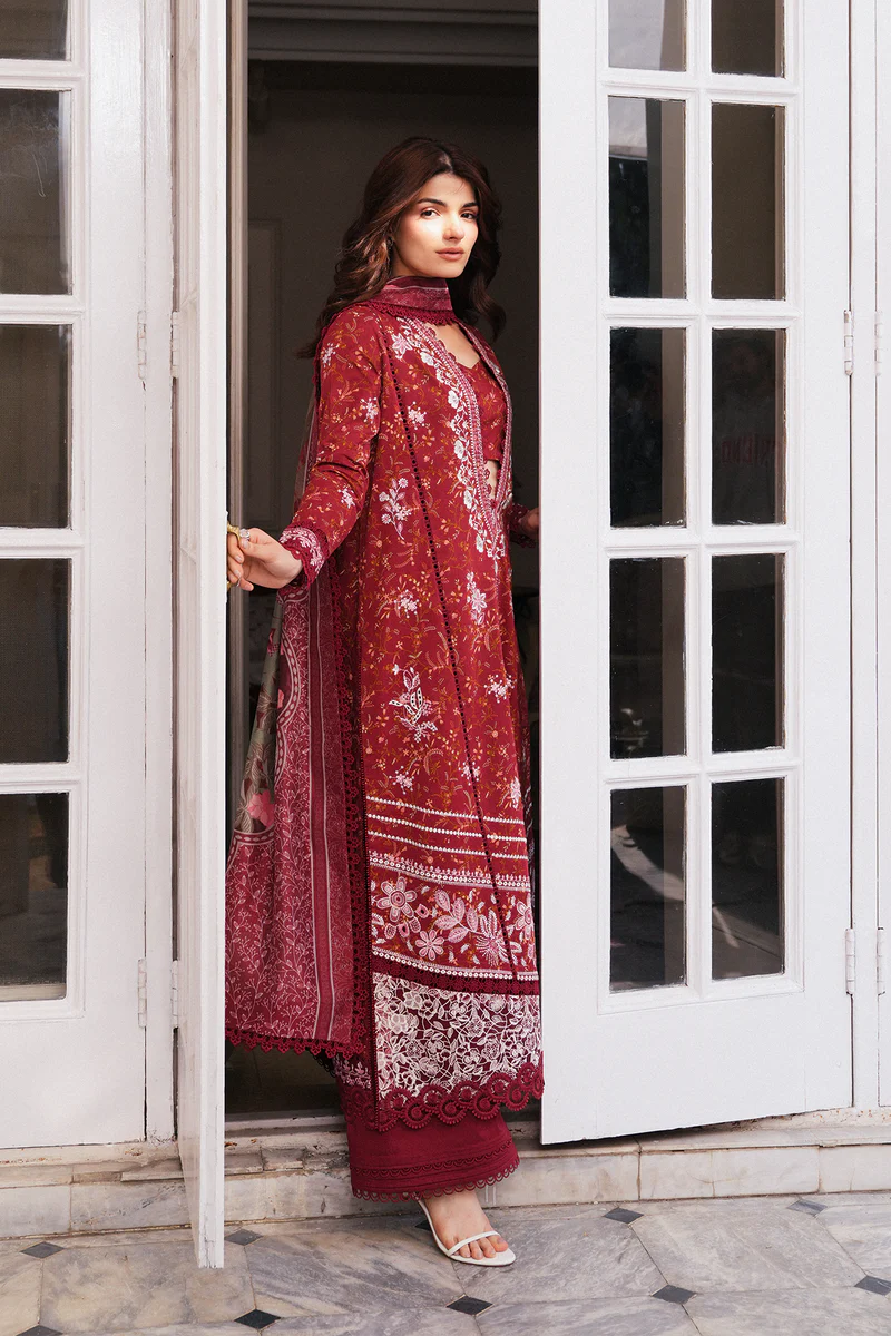 Bold yet intricately feminine, this ensemble blooms in a rich blood-red printed canvas, brought to life with a chintz-inspired pattern that feels timeless and expressive. Delicate embroidery traces the front in fine detail, adding texture and depth while preserving the softness of the print. The trousers mirror the richness of the palette, tailored in a matching tone and finished with embroidered detailing at the hem for a polished, cohesive finish. Framed with embroidered organza borders and paired with a printed silk dupatta that drapes fluidly with a gentle sheen, the look balances heritage craft with striking modern elegance.