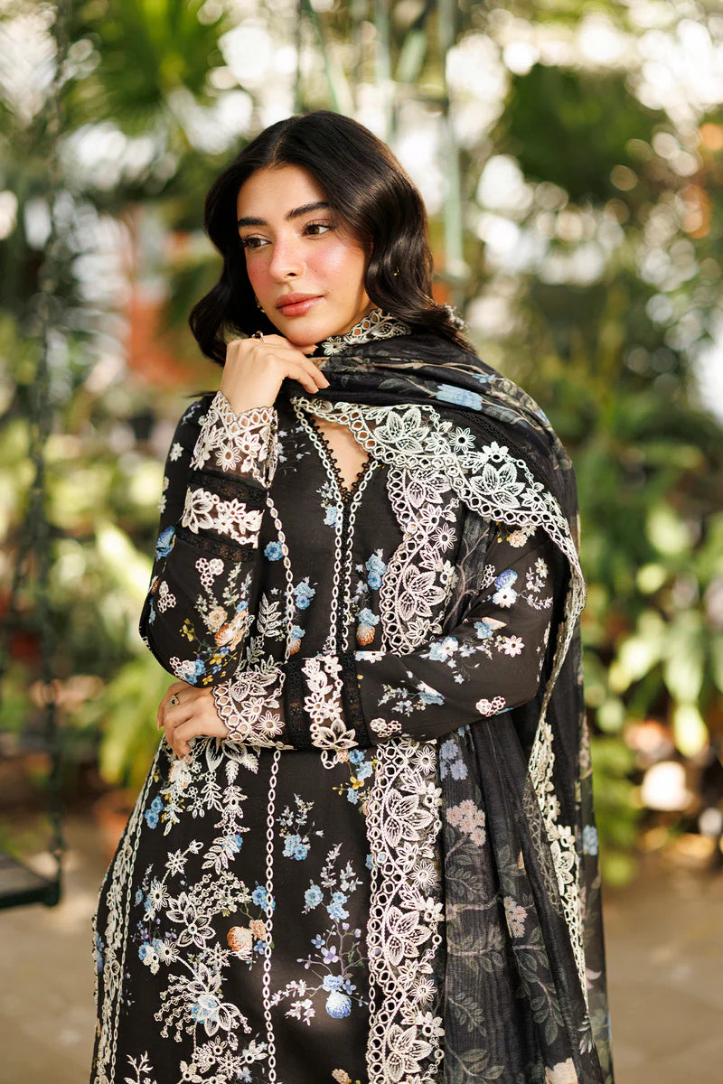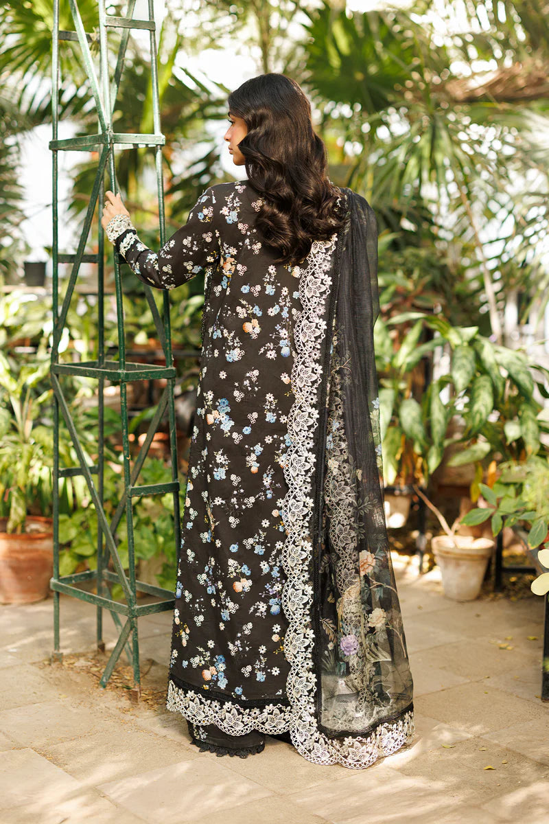 A classic black ensemble elevated with intricate floral embroidery, where delicate ivory and soft blue motifs bloom across the surface with refined detail. The long, straight-cut shirt is framed with ornate embroidered borders that add structure and contrast, while fine embellishment along the neckline and sleeves enhances its elegance. Paired with coordinated trousers and a sheer dupatta edged with complementary embroidery, the look feels balanced and graceful. Set against a natural backdrop, the ensemble embodies timeless sophistication — effortless, versatile, and rooted in artisanal craftsmanship.