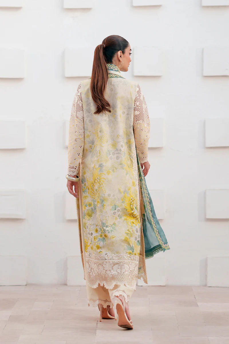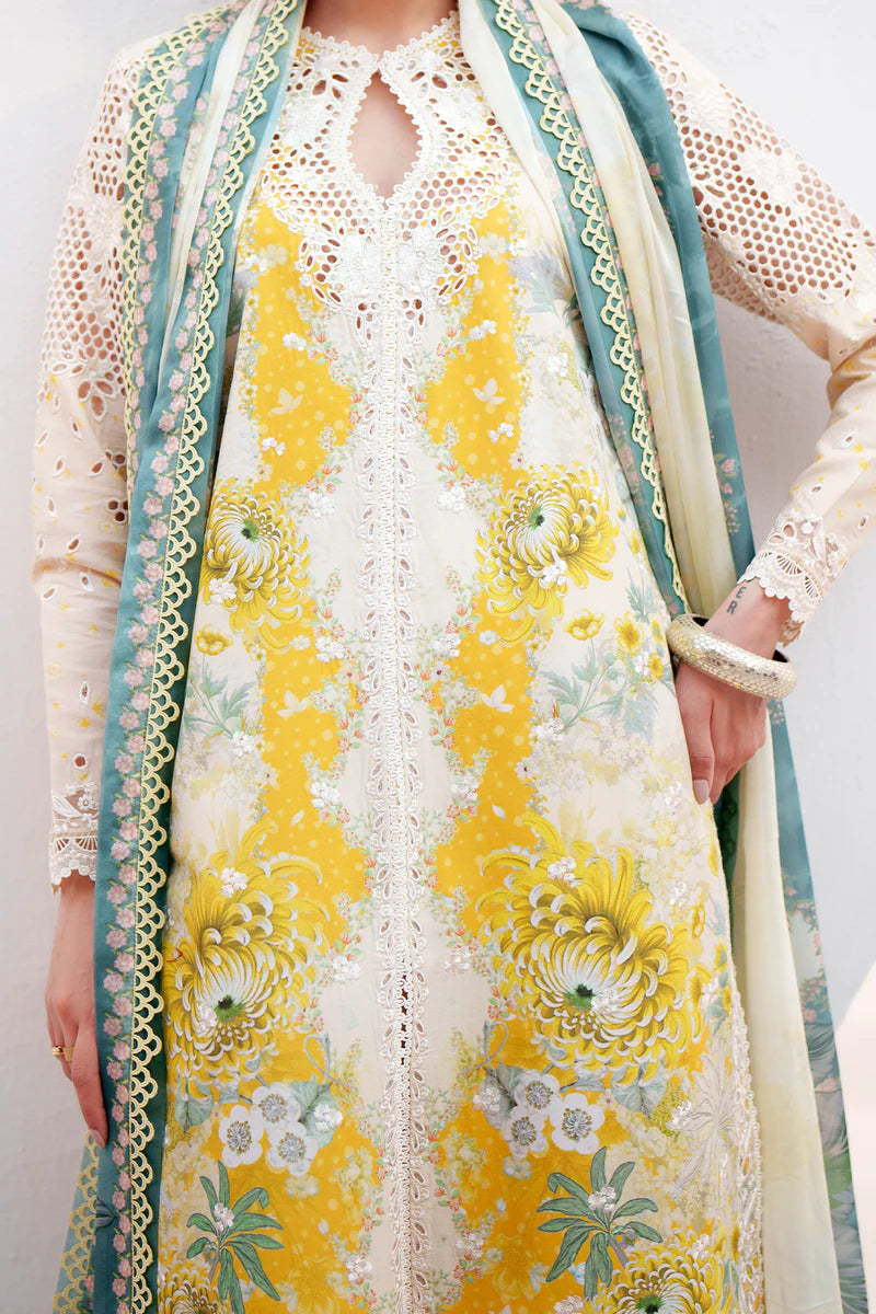 In a vibrant sunlit yellow palette, this graceful ensemble blooms with delicate floral prints in soft greens and hints of ivory, capturing the warmth of a summer garden. Intricate white embroidery and fine cutwork frame the neckline and run along the front, adding texture and refined detail, while lace accents at the hem bring a soft, feminine finish. It is paired with light, straight-cut trousers in a soft neutral tone, keeping the silhouette clean and fluid. A sheer dupatta in a blend of sage green and soft cream, edged with intricate borders, drapes effortlessly to complete a look that feels fresh, radiant, and elegantly composed.