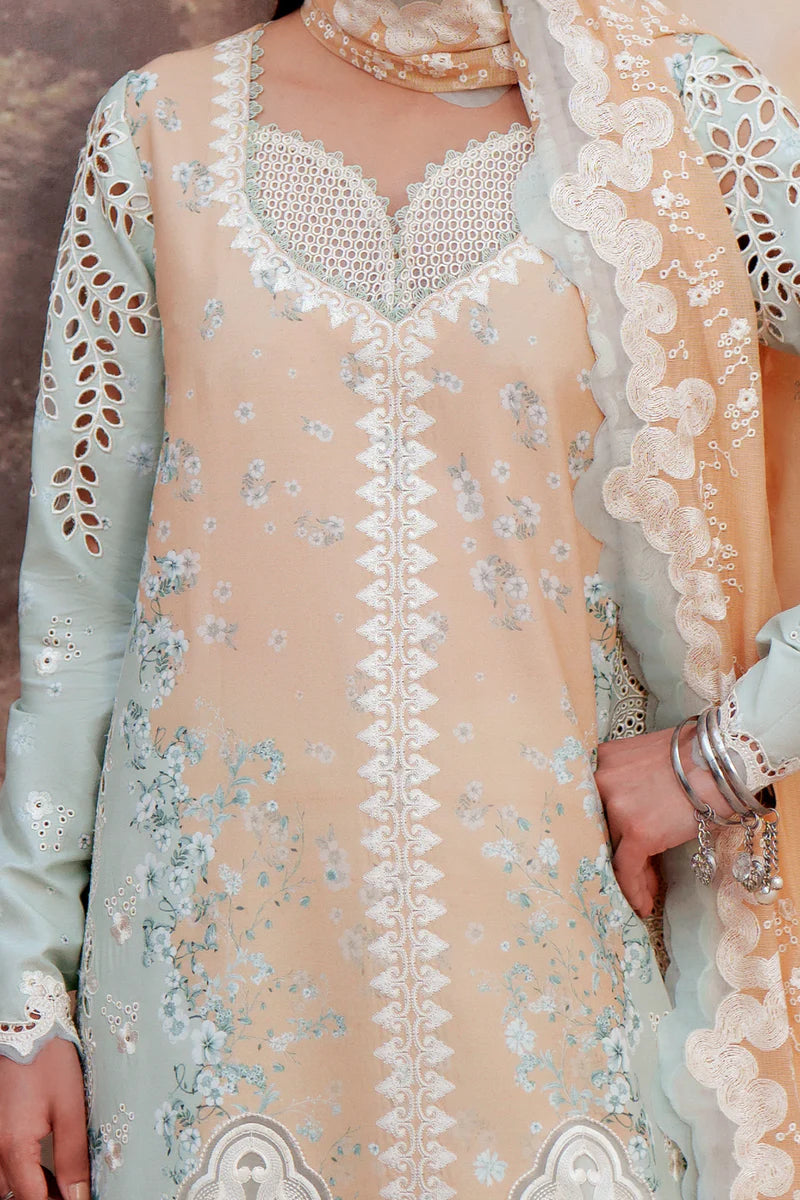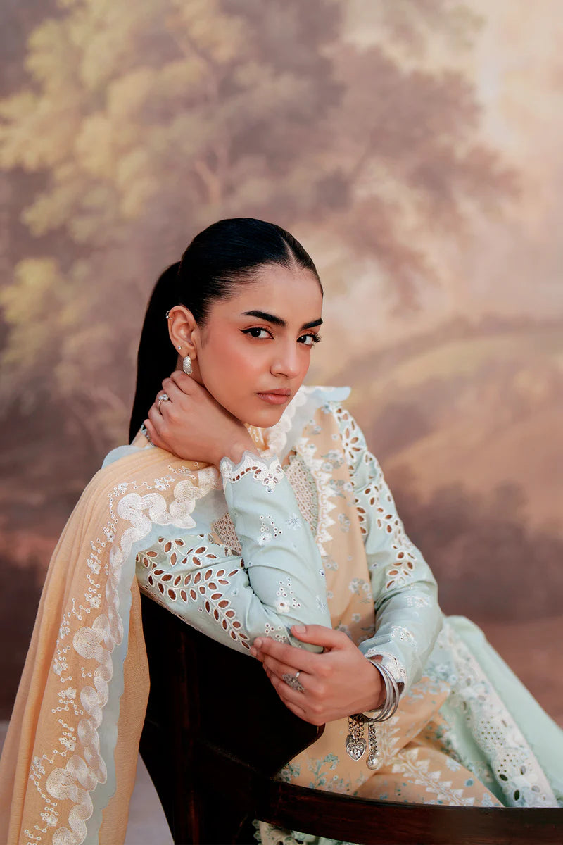 In a soft blend of mint and warm beige, this graceful ensemble unfolds with delicate embroidery in powder blue and ivory, creating a look that feels both fresh and timeless. Intricate threadwork defines the neckline and runs elegantly down the front, while cutwork and lace details along the sleeves and hem add depth and texture. The contrasting panels in gentle peach-beige bring warmth and dimension to the silhouette, balanced by straight-cut trousers that keep the look fluid and refined. A sheer dupatta, edged with scalloped embroidery, drapes softly to complete a set that feels serene, feminine, and effortlessly elegant.