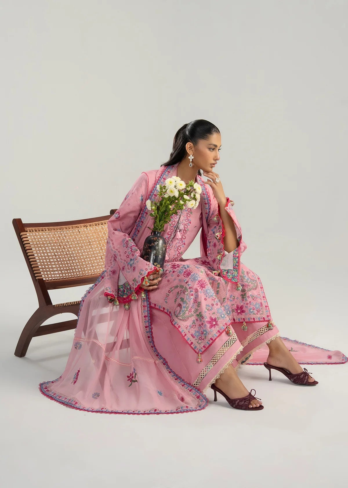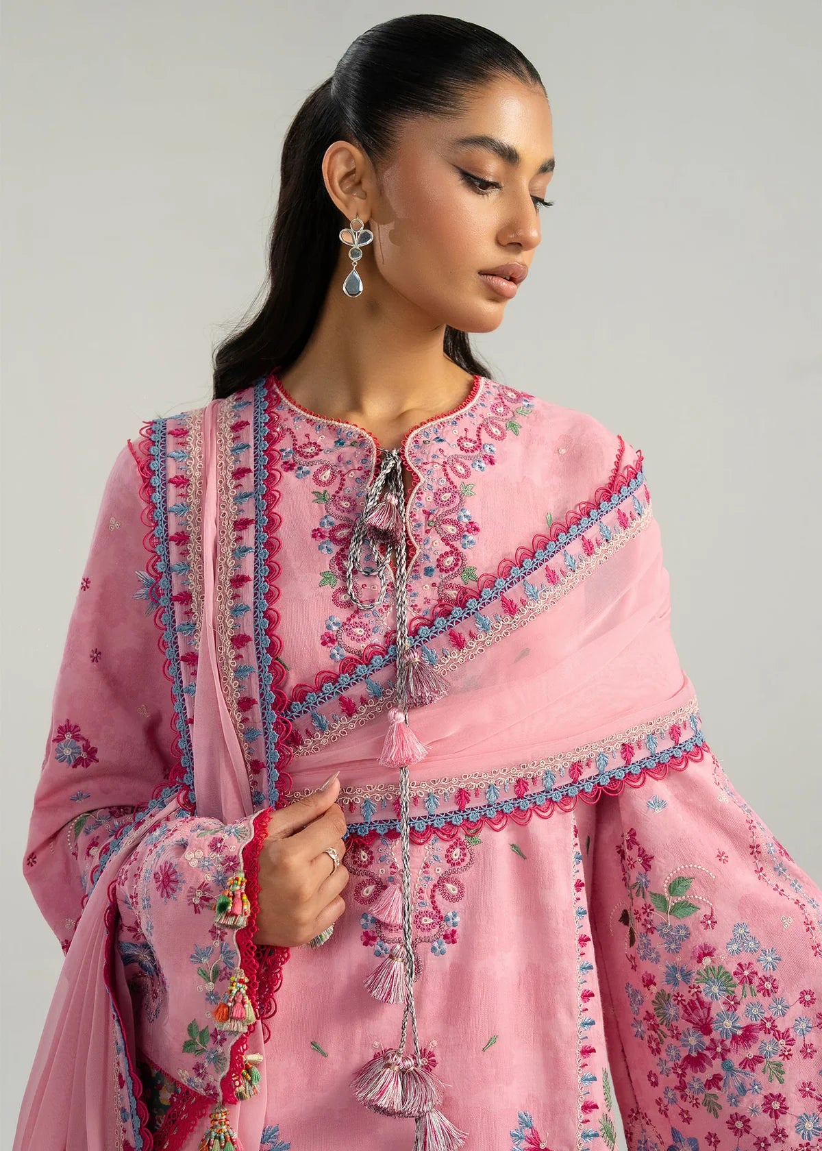 A delicately soothing pink ensemble, designed to brighten the festive season with effortless elegance. The piece features a harmonious blend of pink and blue hues arranged in a refined mirror-style embroidery, adding subtle depth and charm. Crafted on rich jacquard fabric, it beautifully enhances the overall design aesthetic. Paired with a matching pink chiffon dupatta, this ensemble offers a graceful and polished finish.
