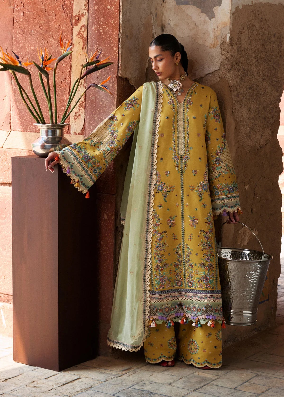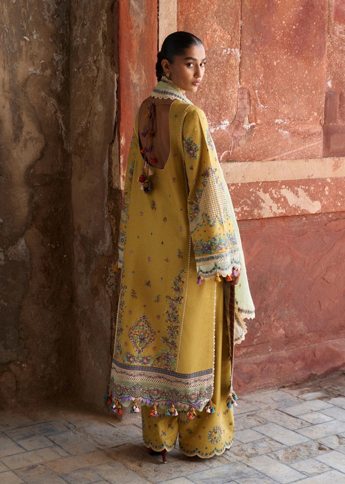 A refreshing yellow ensemble perfect for the festive season, adorned with vibrant, intricately detailed multicolored embroidery and delicate white Schiffli accents that add depth and texture. It is paired with a dreamy mint green chiffon dupatta, beautifully enhanced with subtle floral embroidery for a soft, elegant finish.