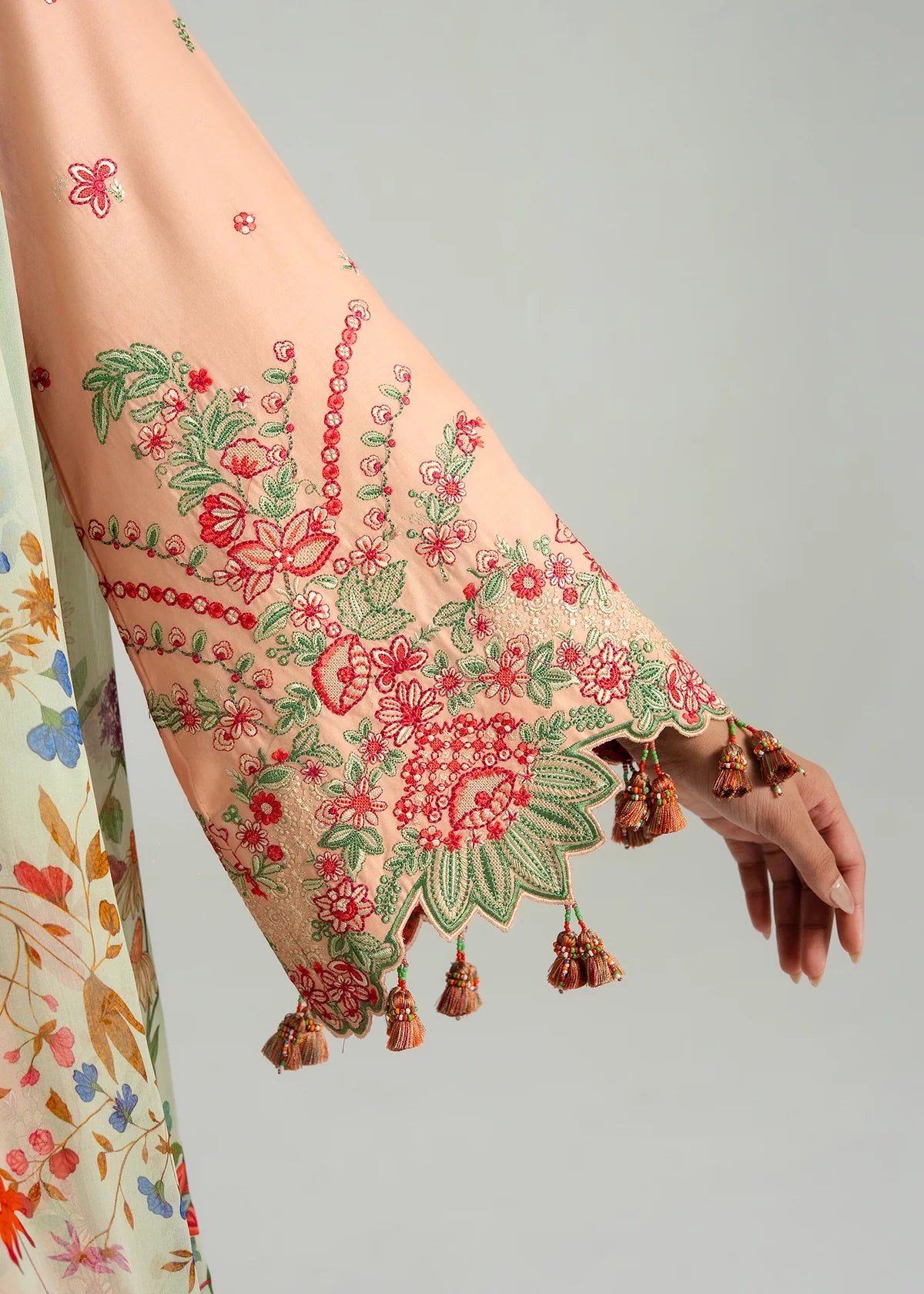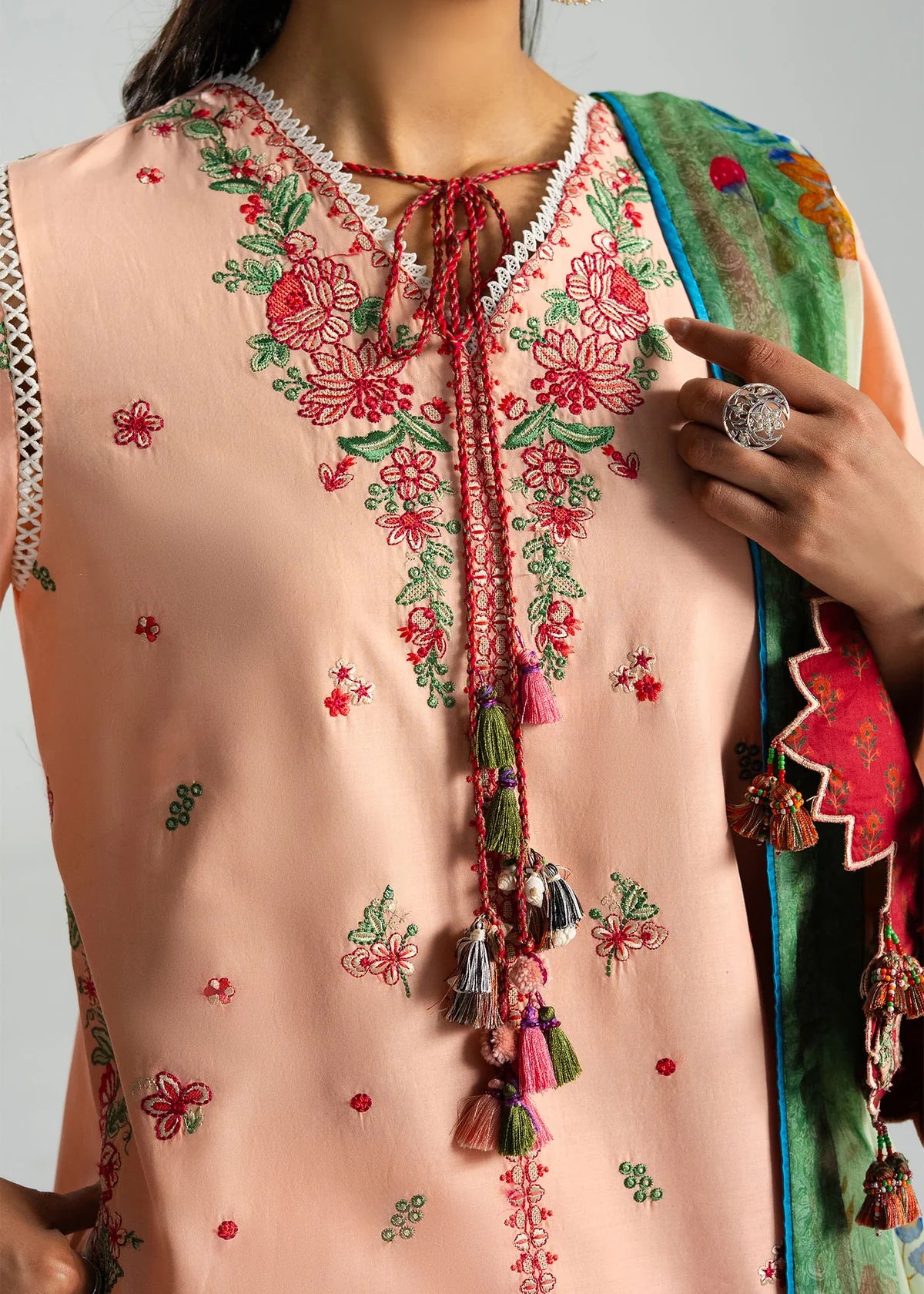 A soft light peach ensemble, perfect for elevating your festive wardrobe with a touch of elegance. Adorned with vibrant embroidery in refreshing shades of red, pink, and green, the piece beautifully comes to life with a striking yet graceful appeal. Finished with a printed dupatta, it adds a hint of charm and completes the look with effortless sophistication.
