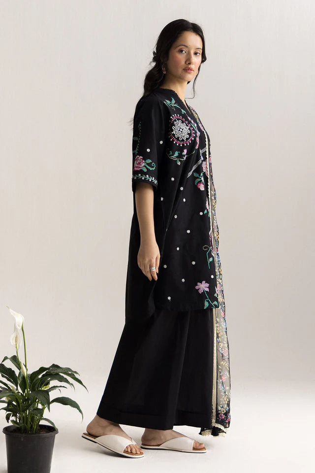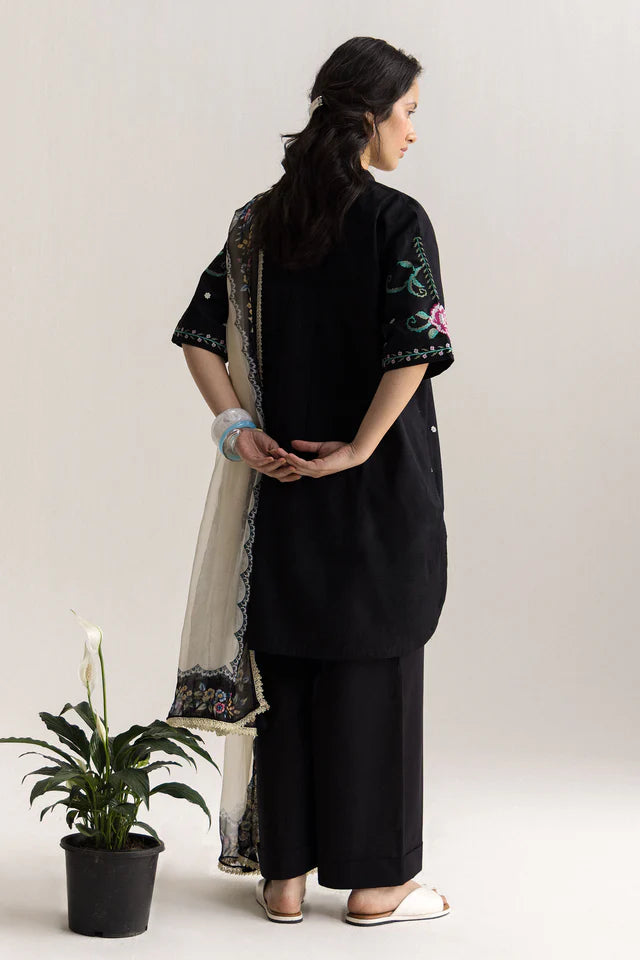 A bold, contemporary composition grounded in a richly textured self-jacquard base. The embroidery takes on an asymmetrical, almost artistic quality, with floral vines and geometric frames unfolding across the surface in an unconventional layout. The dupatta introduces stark contrast through monochrome tones, framing the look with a crisp, modern edge.