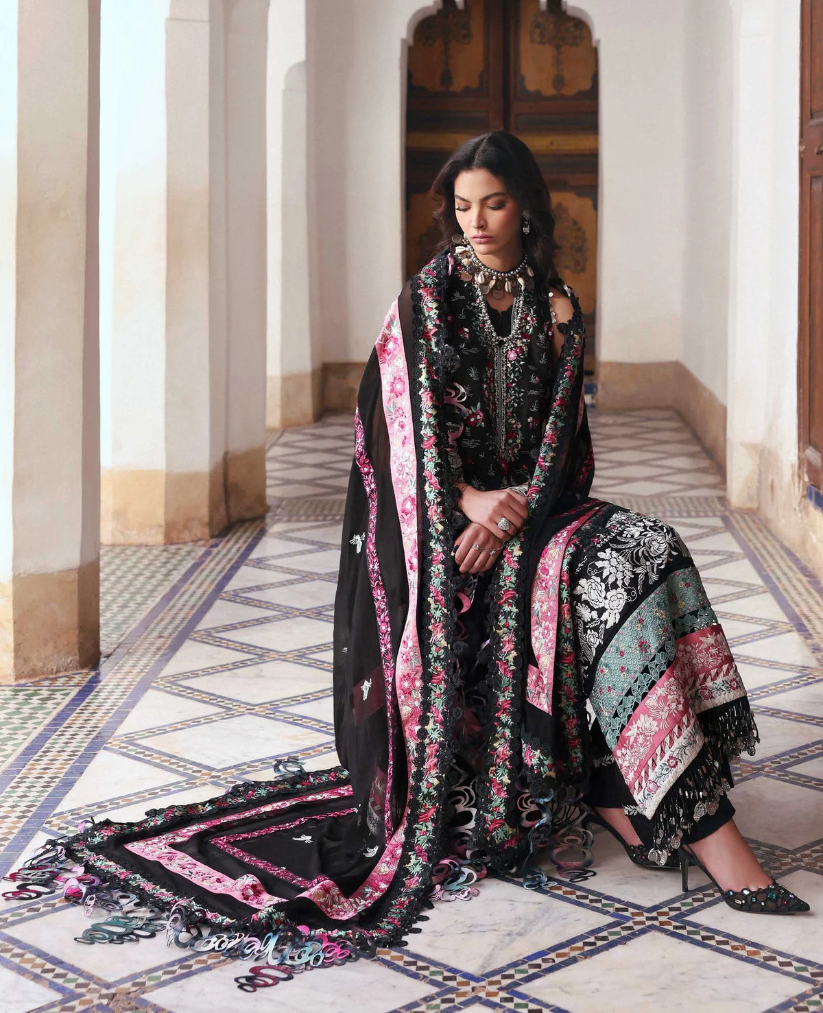 This three-panel black shirt is crafted with intricate Parsi Gara embroidery, showcasing classic floral and shikargah motifs in delicate shades of pink, green, and yellow, beautifully highlighted with crisp white accents. The silhouette is elevated with contrasting satin silk borders along the hem and back, enhanced with a graceful spray of embroidery. Floral-detailed sleeves finished with an organza hem border add a refined touch, while the chiffon dupatta adorned with four-sided embroidered and printed contrast pattis completes the ensemble with effortless sophistication.