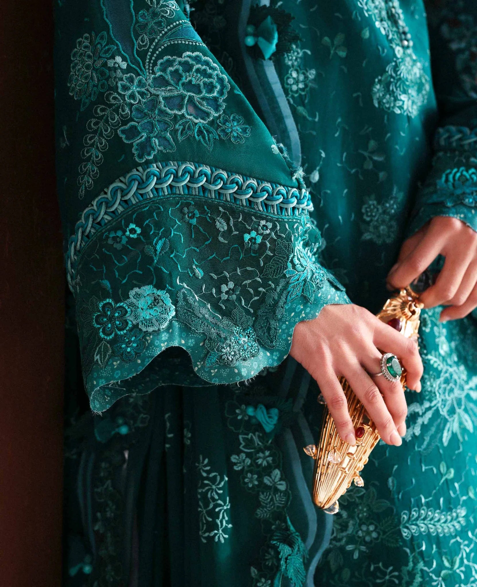 This three-panel green shirt is adorned with an all-over delicate leafy texture in monochrome tones, accented with subtle floral details and a modern, graceful neckline. The organza hem border adds structure and elegance, while the sleeves feature intricate laser-crafted floral sprays finished with a scalloped organza edge. Paired with a flowing chiffon dupatta detailed with a four-sided scalloped floral border and organza motifs, this ensemble is soft, sophisticated, and perfect for festive celebrations. Completed with cambric trousers for a polished, airy look.