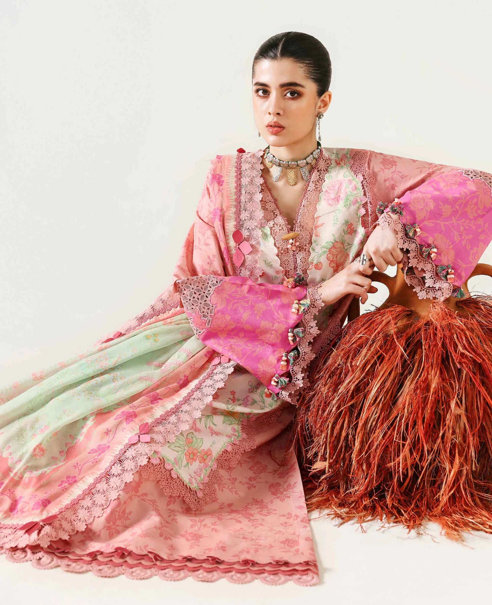 Color-blocked coral and white lawn shirt adorned with vibrant, colorful florals, creating a fresh and lively statement. Paired with a beautifully coordinated color-blocked dupatta, this unstitched ensemble is the perfect summer essential, blending breezy look.