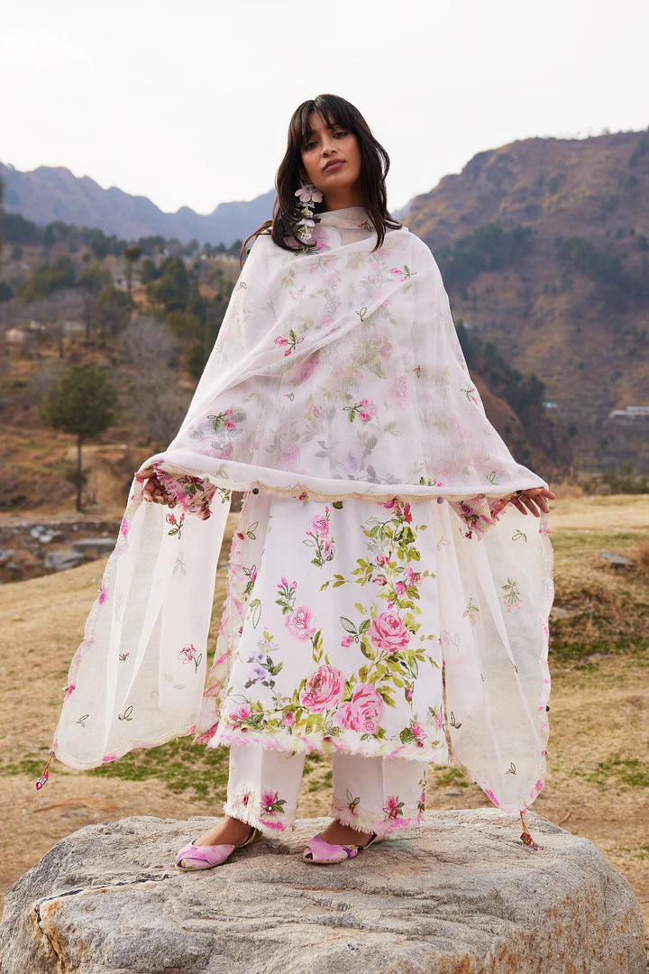 A textured cotton net dupatta, adorned with embroidered floral motifs, completes the ensemble with ethereal charm. Light as air yet beautifully composed, it drapes like a veil of lilac mist—romantic, luminous, and endlessly feminine.