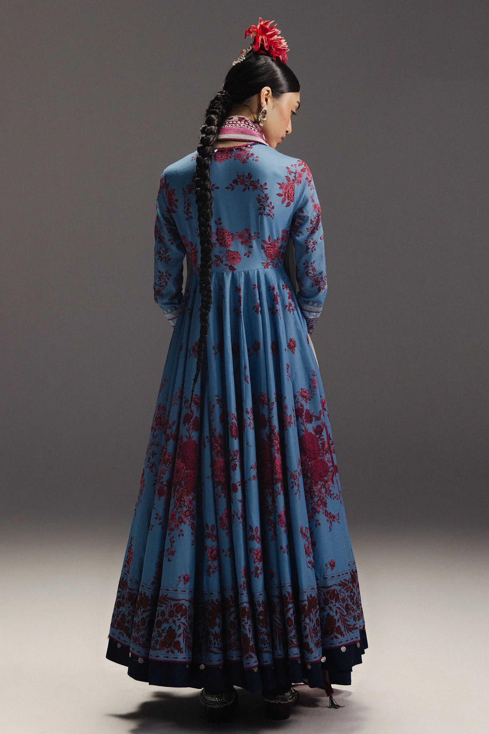 Falak Ara is a graceful Anarkali composition crafted in breathable, high-thread-count Pima lawn in a soft, ethereal light blue that evokes the serenity of an open sky. The bodice, panels, and sleeves are adorned with delicately scattered floral clusters, subtly anchored by a vibrant red botanical border at the hem that lends striking contrast and definition to the flowing fourteen-panel silhouette. Paired with digitally printed maroon cambric trousers featuring a continuous running floral pattern, the ensemble achieves a rich and grounded depth. The look is completed with a pristine cream silk dupatta detailed with an intricate floral jaal spray, adding vintage refinement and timeless elegance to this contemporary yet regal design.