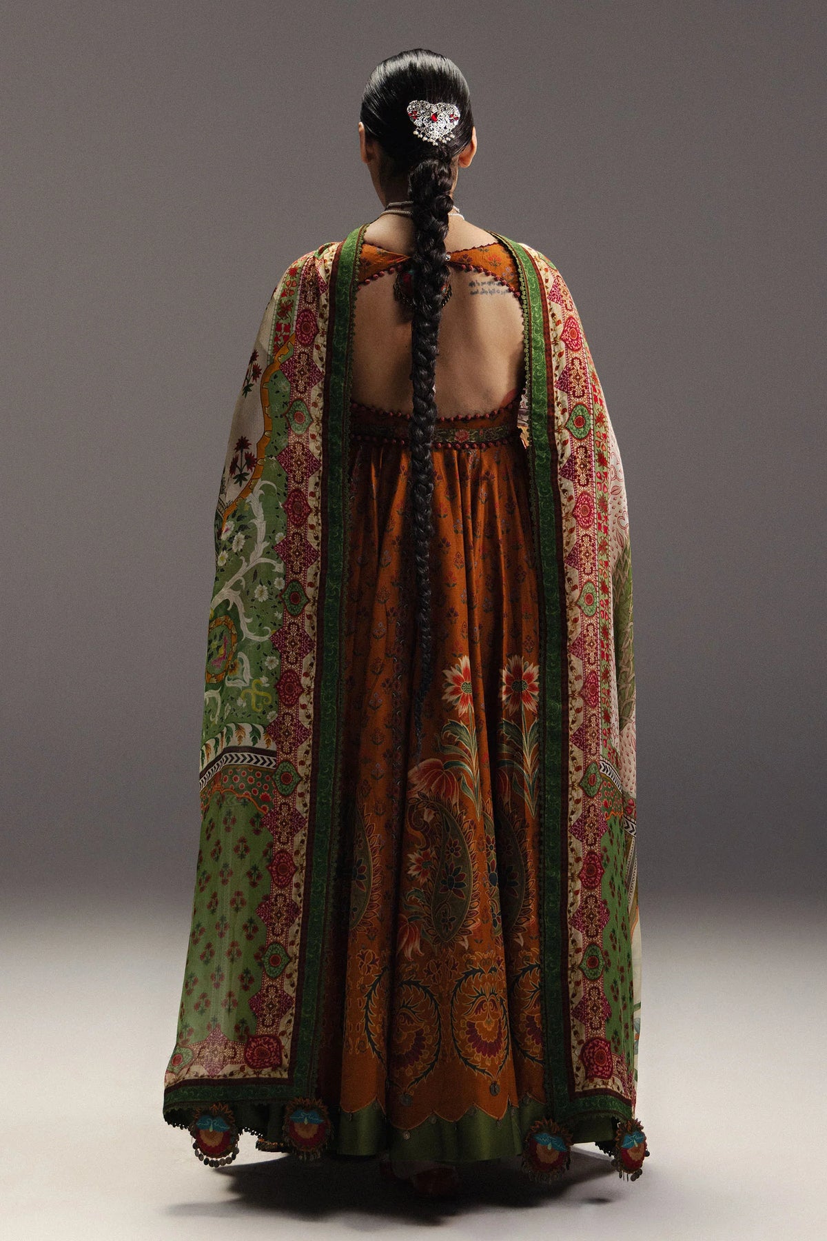 Zarfashan is a Persian Paisley-inspired Anarkali crafted in warm, inviting shades of antique gold, terracotta red, and forest green on high-grade Pima lawn. The design features repeat Mughal buti motifs that elegantly transition into a heavy border of large-scale traditional paisley scrolls, lending structure and grandeur to the fourteen-panel silhouette. A versatile multi-panel silk dupatta showcases hand-painted style botanical paisley bunches at its center, harmonizing perfectly with the heritage-rich motifs. Zarfashan exudes artisanal sophistication, timeless elegance, and Mughal-inspired craftsmanship, making it a statement Anarkali for those who cherish classic yet regal style.