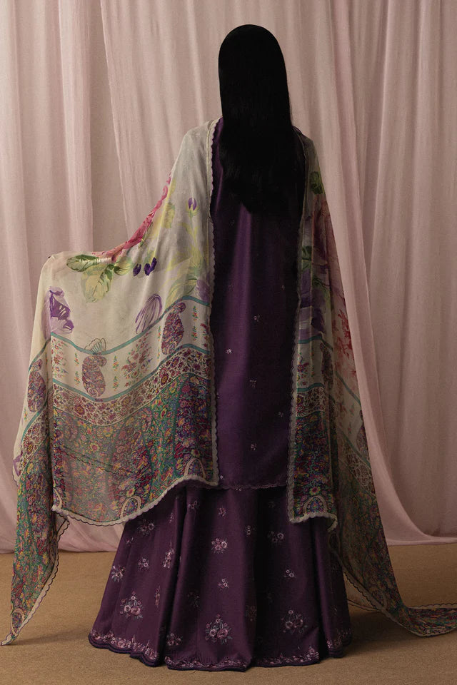 Sumire is crafted in dusty plum Pima lawn, adorned with intricate floral and paisley embroidery across structured panels for a balanced, elegant silhouette. Paired with an all-over printed chiffon dupatta and matching embroidered cambric trousers, the ensemble reflects quiet sophistication and heritage-rooted grace.