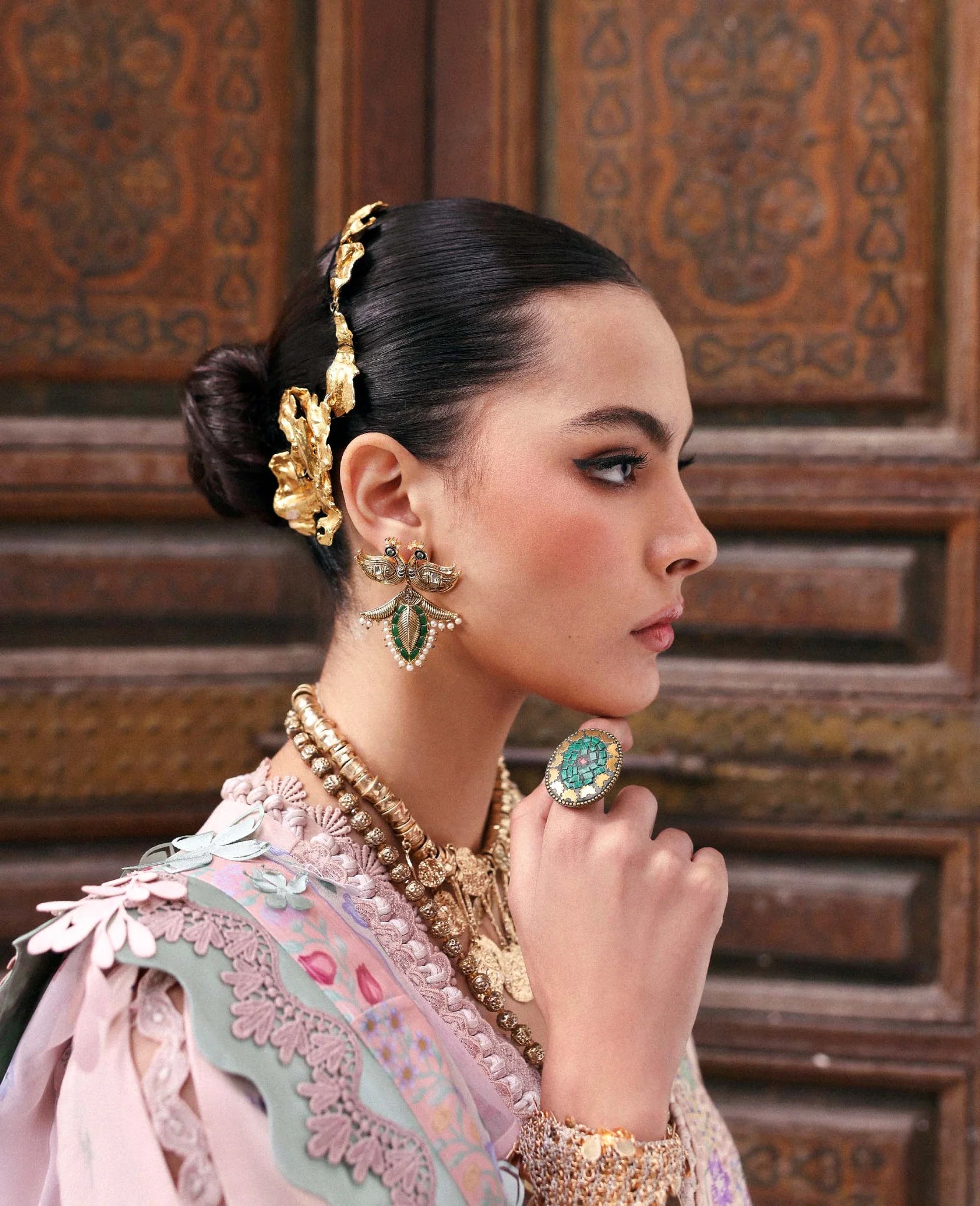 This front-open lawn shirt is fully embroidered with an allover boring pattern, kept light and breathable in a serene palette of whites, blues, and soft lilacs. Delicate floral motifs add a timeless elegance that feels perfect for day-long festivities. Finished with composed sleeves featuring a patterned organza border and a beautifully detailed organza hem, every element is designed to look refined yet effortless. Made for Eid moments, graceful, airy and meant to be worn from morning gatherings to evening celebrations.
