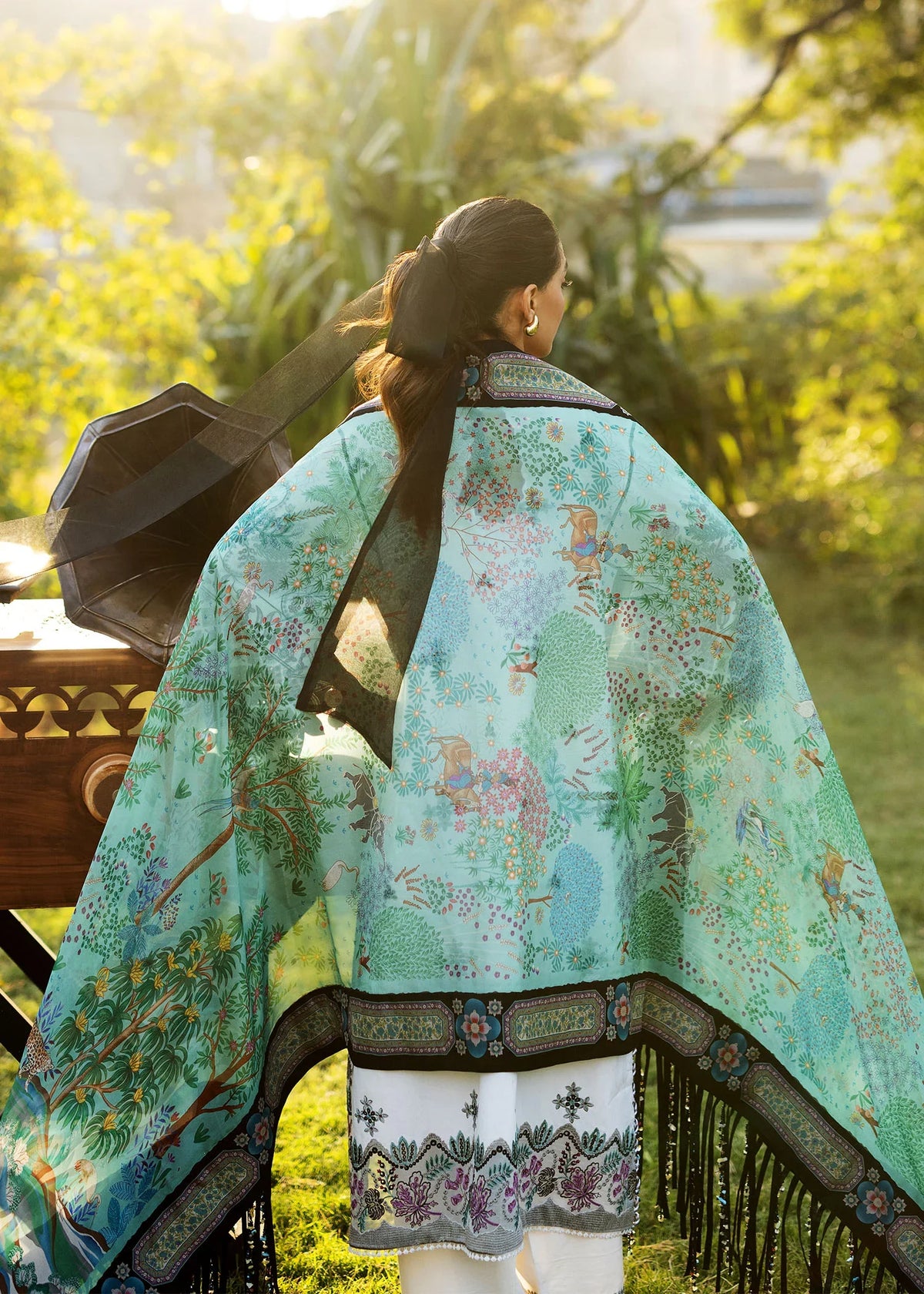 A panelled chikankari base comes with an elongated contrasting neckline in charmeuse silk to match the color offset of a digitally printed shikar gah inspired silk dupatta.