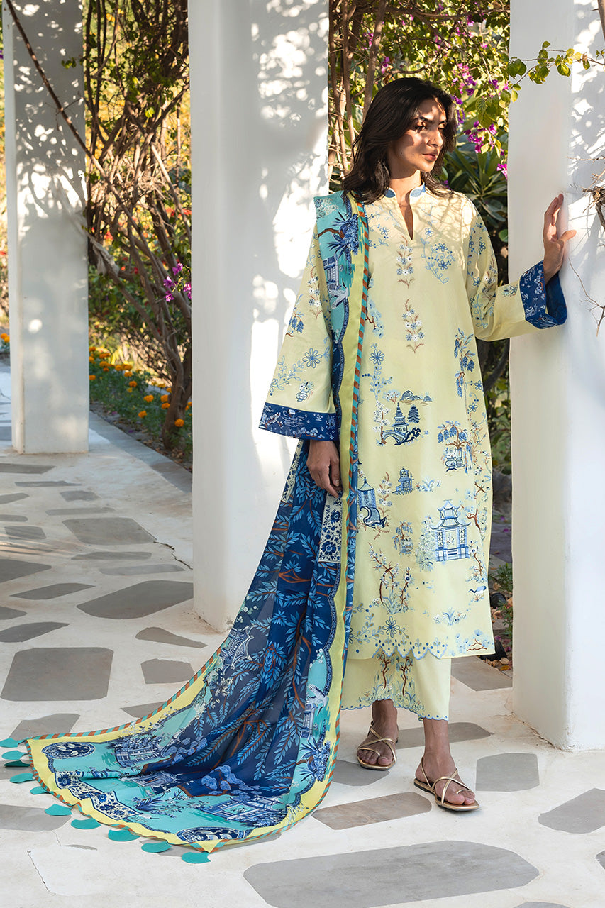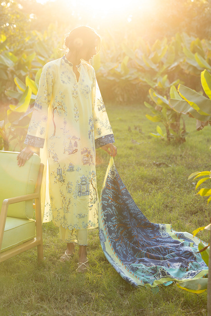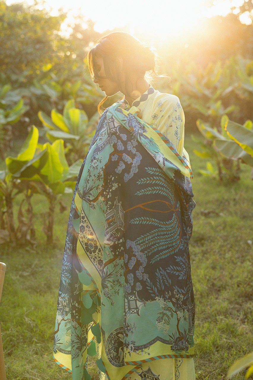 Echoing the charm of a pastoral landscape, a pale butter yellow jacquard lawn shirt is adorned with toile inspired scenic embroidery in shades of cornflower blue and soft navy, depicting architectural and pastoral motifs in a balanced composition. Contrasting navy cuffs lend definition to the silhouette. The ensemble is paired with matching jacquard cotton culottes, finished with embellished scalloped hem. A statement medium silk dupatta in layered tones of deep navy, aqua, and butter yellow completes the look with an intricate scenic and botanical print.