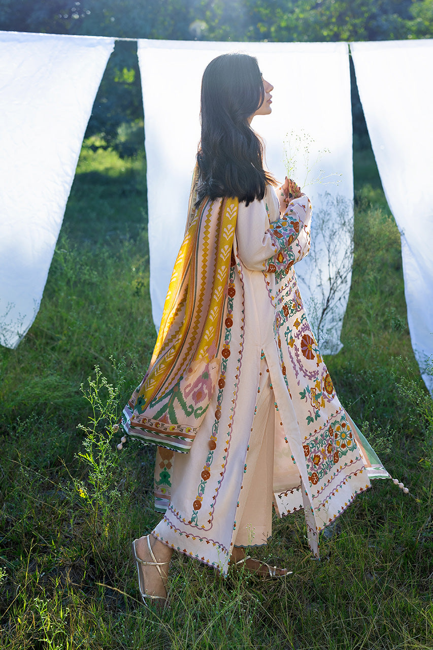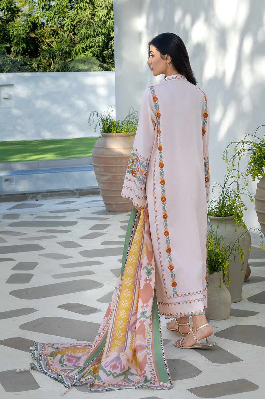 Warm, earthy tones shape this soft blush jacquard lawn shirt, detailed with folk inspired floral and geometric aari embroidery in accents of chestnut, burnt tangerine, and celadon. Delicate floral embroidery highlights the neckline, while scalloped edging traces the sleeves and hem. The look is paired with matching jacquard lawn culottes finished with scalloped edges. A printed medium silk dupatta completes the ensemble, featuring bold folkloric motifs.