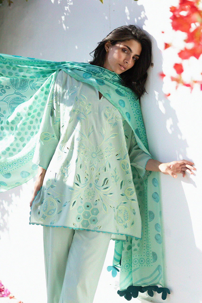 Fresh and tranquil in mood, a seafoam green jacquard lawn shirt is enriched with refined botanical embroidery, accented by playful pomegranate motifs in deeper tones across the surface. Delicate geometric embroidery defines the neckline with subtle precision. A statement medium silk dupatta in layered shades of seafoam green introduces bold geometric forms interspersed with stylised pomegranate elements, framed by a contrasting border for graphic impact. The look is completed with a matching jacquard cotton shalwar, finished with an embroidered hem.