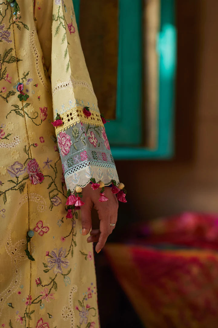 Paired with a floral embroidered voile dupatta, light and airy in its drape, the look captures a soft, romantic cadence, feminine, refined, and effortlessly timeless.